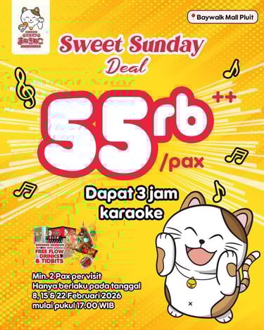 Check-in jam 10.00–12.00, nikmatin 2 jam nyanyi + minum & camilan sepuasnya!