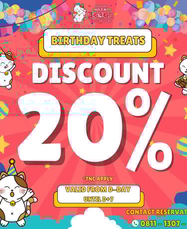 Ulang tahunmu semakin seru di Karaoke Manekineko! Dapatkan diskon 20% untuk rayakan hari spesialmu dengan cara yang paling menyenangkan! 🎶