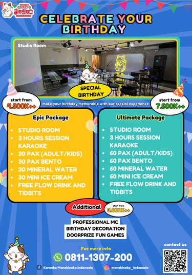 Yuk ajak teman-temanmu, bernyanyi sampai puas dan jadikan ulang tahunmu penuh keceriaan di Manekineko! 🎤🎂