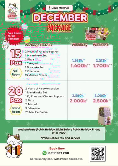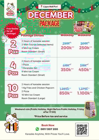 Nikmati momen akhir tahun dengan paket karaoke spesial Desember! Waktu terbaik untuk berkaraoke bersama keluarga, teman, atau rekan kerja dengan harga yang lebih hemat. Reservasi sekarang dan rayakan Desember dengan cara yang lebih seru.