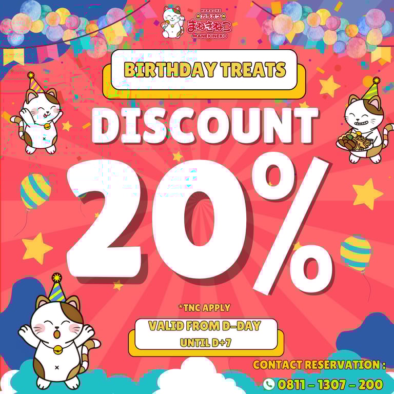 Ulang tahunmu semakin seru di Karaoke Manekineko! Dapatkan diskon 20% untuk rayakan hari spesialmu dengan cara yang paling menyenangkan! 🎶